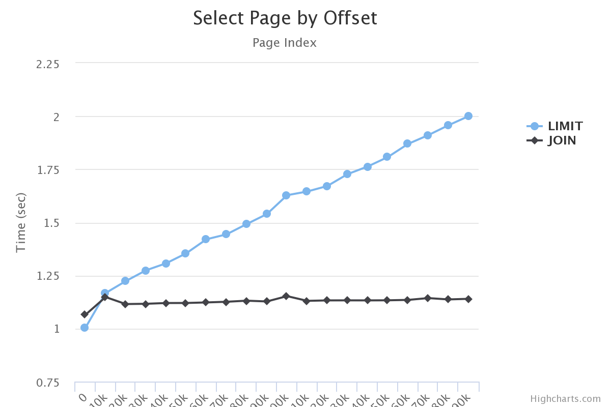 위의 그래프는 페이지 위에서 언급하듯 페이지 값이 커질수록 속도가 느려지지만 join을 이용한다면 우리가 영점 사격을 하듯 평균적인 값을 유지하는 것이 보입니다. 그래서 저는 limit만 사용하는 것이 아닌 Join절과 함께 쿼리를 사용하는 것을 권장드립니다.