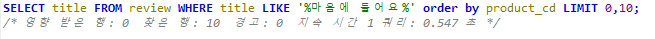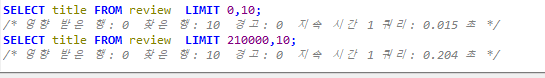 극단적이겠지만 먼저 LIMIT 0,10의 결과 값과 210000,10 의 쿼리 수행속도 차이를 보여드립니다.