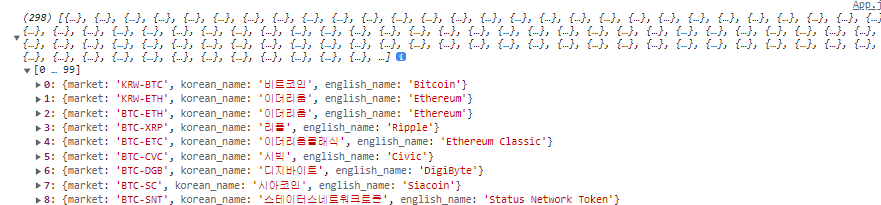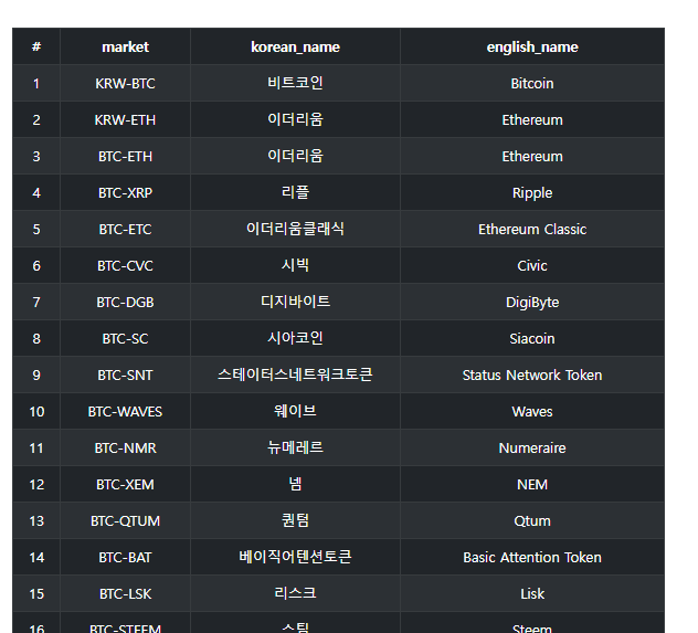 그리고 업비트에 등록된 코인 데이터를 가져옵니다.