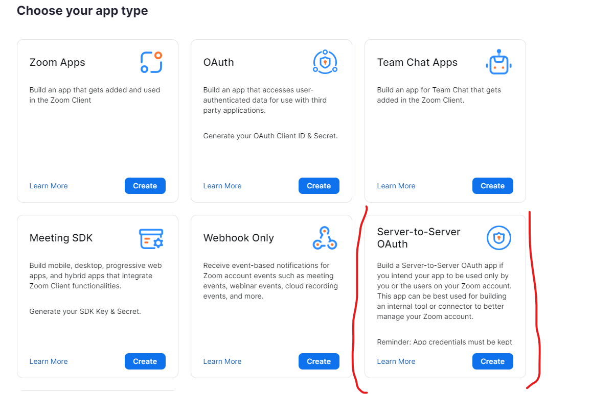 마켓플레이스 https://marketplace.zoom.us/develop/create로 이동하여 앱 생성을 해줍니다.
