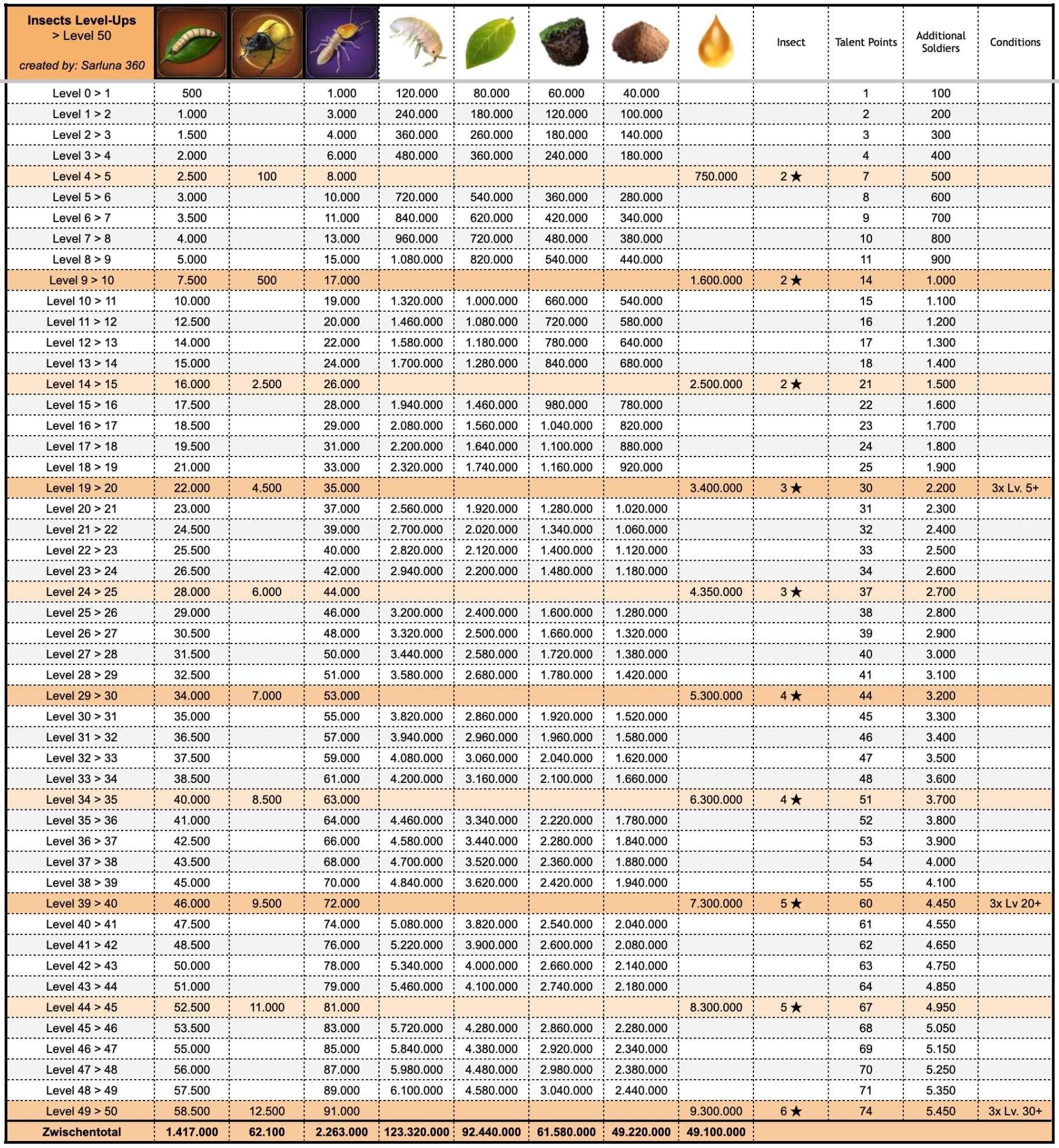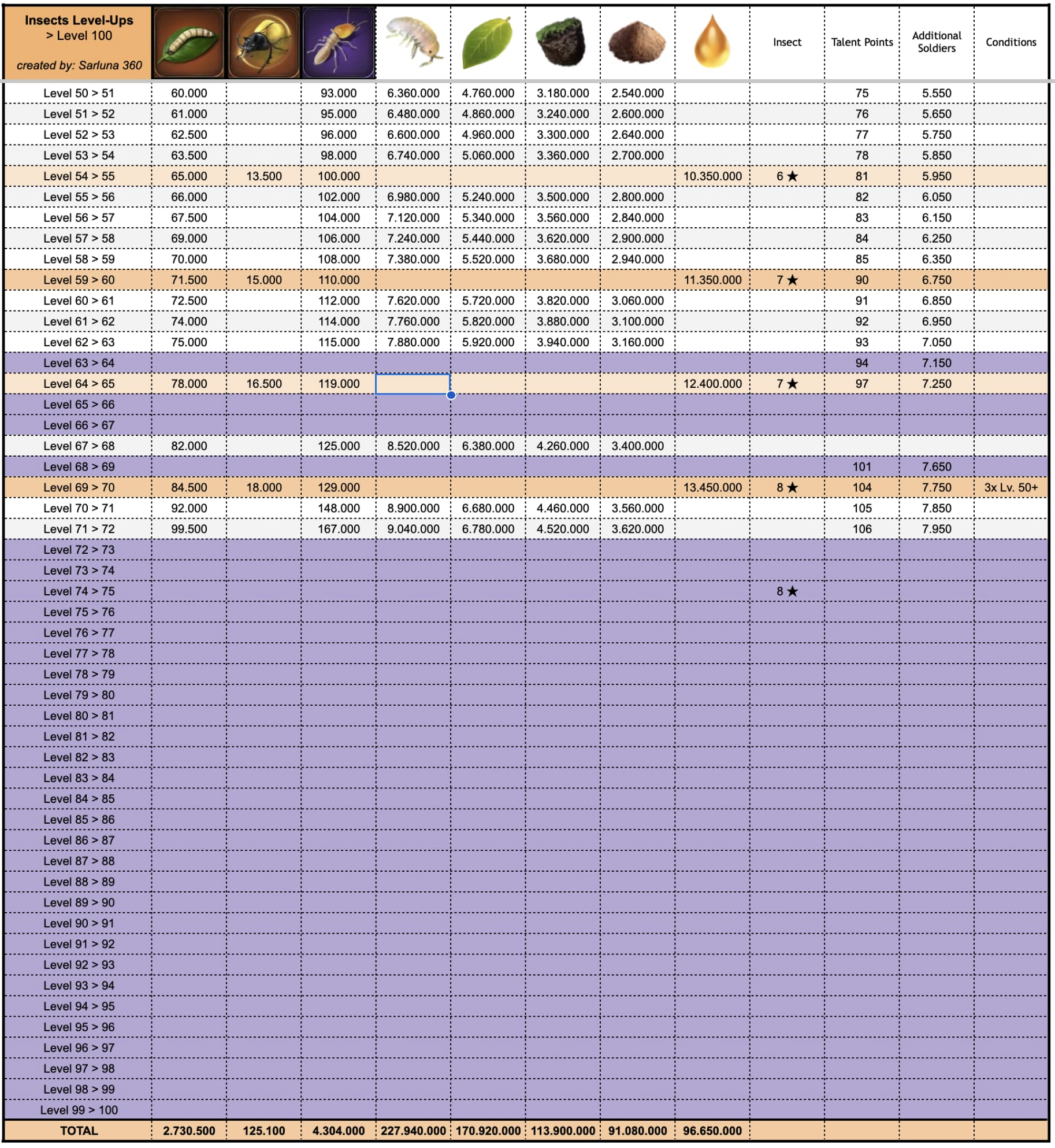 [the ants] 디앤츠 야생 레벨별 필요 사료 및 자원 차트