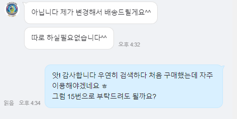 블라스토무사랑 코코웜 2개를 구매하려했지만, 블라스토무사가 폐사되었다고 해서 브레인으로 변경하였다. 브레인이 폐사한 개체보다 가격이 좀 더 비싸서 추가금액을 이체해야하는지 취소후 재구매해야하는지 여쭤보았는데 공짜로 변경해드렸다. 처음 이용해봤는데 자주 이용해야겠다. (사장님 돈 많이버세요 ^^)