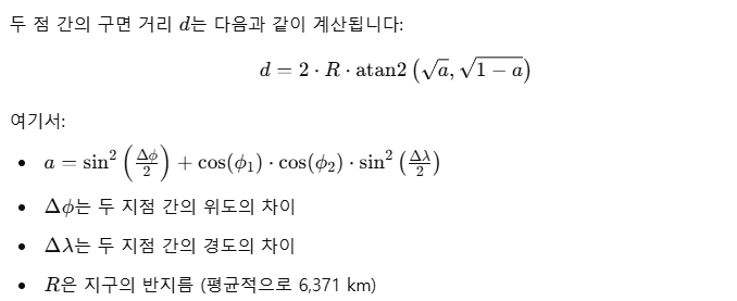 하버사인 공식을 SQL로 구현하여 두 지점 사이의 최단거리를 구할 수 있습니다. 이 공식은 지구의 구형 구조를 기반으로 하여 위도와 경도를 사용해 두 위치 간의 거리를 계산합니다. SQL에서 하버사인 공식을 사용하려면 각 지점의 위도와 경도를 라디안으로 변환하고, 삼각함수를 사용하여 거리를 계산합니다.