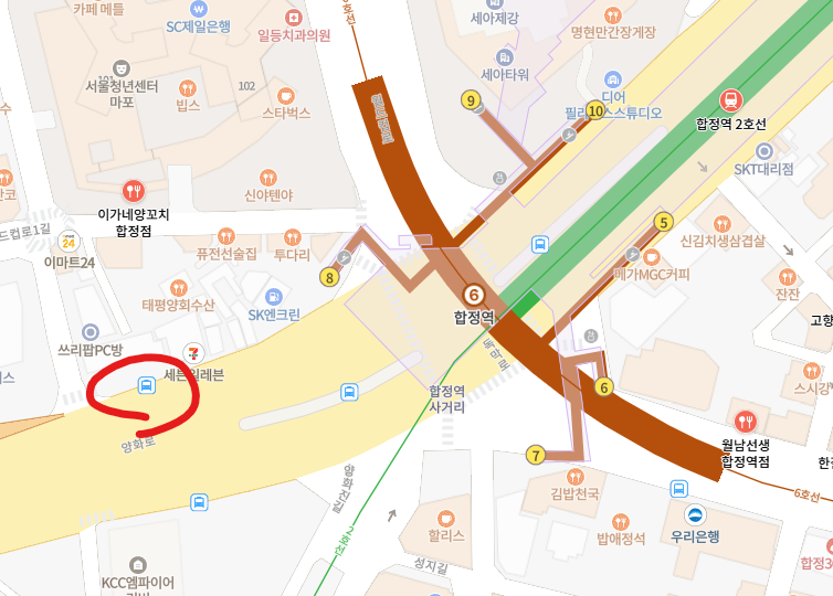 저는 은평구에서 6호선을 타고 합정역에 도착 후 8번출구에서 조금만 나가면 세븐일레븐 앞에 정류장이 있습니다. 배차는 대략 15분~20분정도였었고, 아침이라 그런지 버스가 빨리오는 편인 느낌이었습니다.