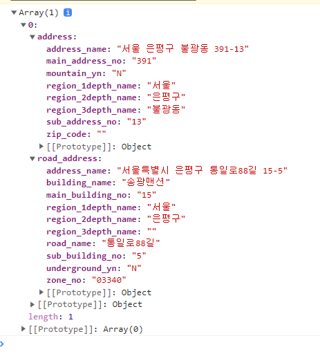 그리고 getAddr(위도, 경도)로 함수를 실행하면 위의 최종 결과물을 얻을 수 있습니다.