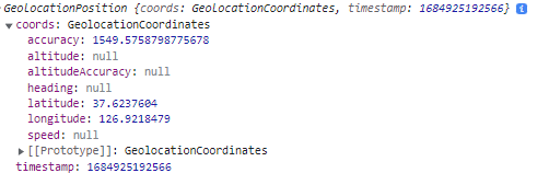 getCurrentPosition의 success에서 콜백 리턴 값을 받으면 위도와 경도를 확인할 수 있습니다.